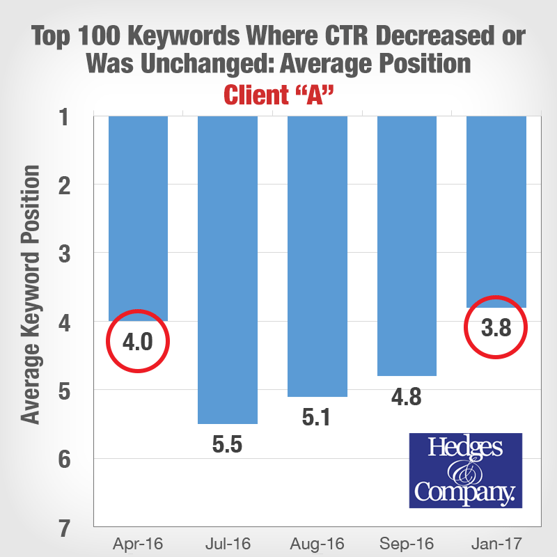 The top 100 keywords where the CTR stayed the same or dropped started at an average ranking of 3.8– a better average than the first group of keywords. Nine months later, their average position barely changed, at 3.4.