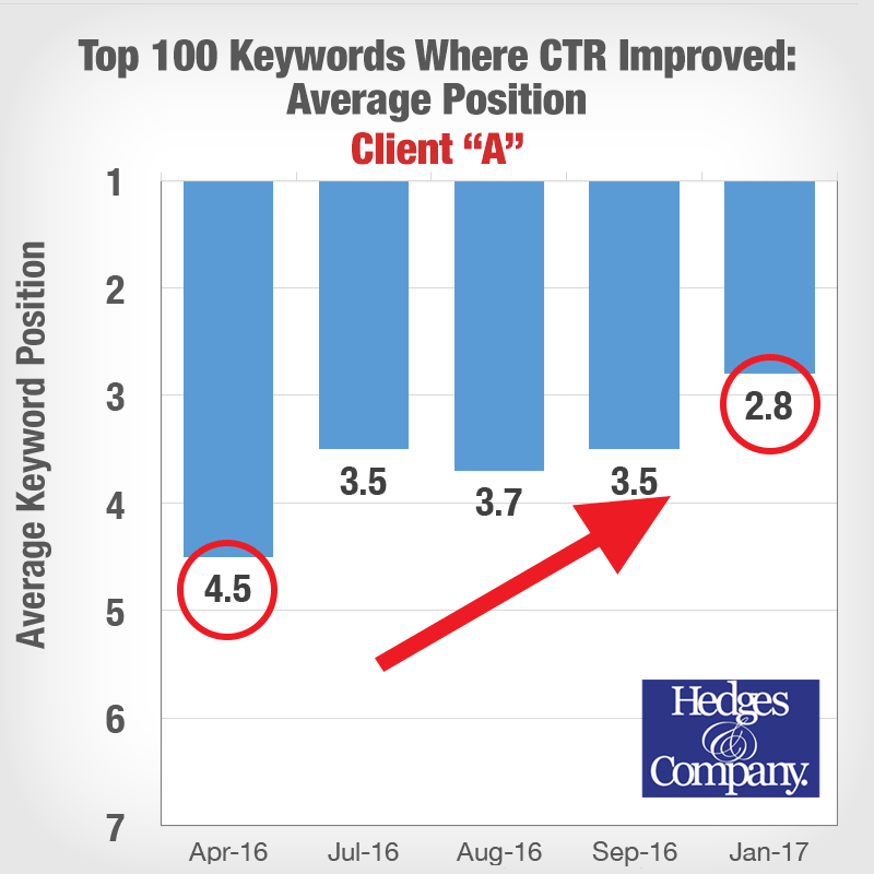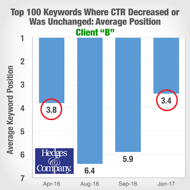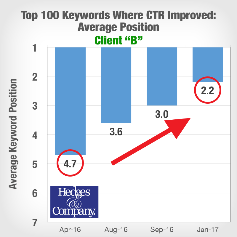 The top 100 keywords where CTR improved started at an average organic ranking position of 4.7 (see first chart for Client “B”). Four months later the average organic position improved to 3.6, then 3.0, and in January 2017 had an average position of 2.2, an improvement of 2.5 positions!