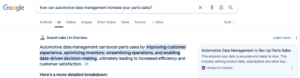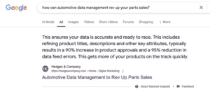 Here’s an example of Google results for a search query, “How can automotive data management increase your parts sales?” Stick with us, this will be a little self-serving, but hopefully educational, too (you can click to enlarge). The page in this image was optimized for AI search.
